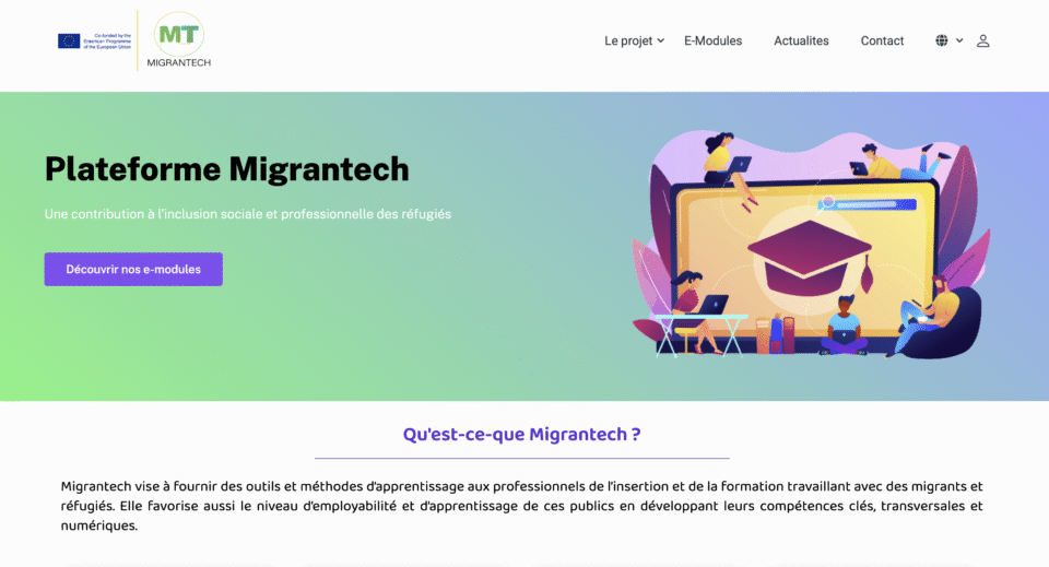Migrantech est une plateforme numérique développée via le programme Erasmus+ en partenariat avec Familles du Monde (Belgique), Factor Social (Portugal) et Anatolia Youth Association (Turquie), reconnue comme “meilleure bonne pratique” en Europe.